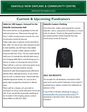 WE NOW ACCEPT E-TRANSFERS. If this is your preferred method of donation, please send your e-transfer and completed donation form to oakvillecommunityclub@gmail.com. Donation forms can be found on the Community Centre/Daycare page.